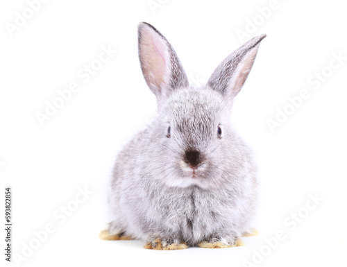 Fototapeta premium Cute grey little rabbit on white background during spring. Young adorable...