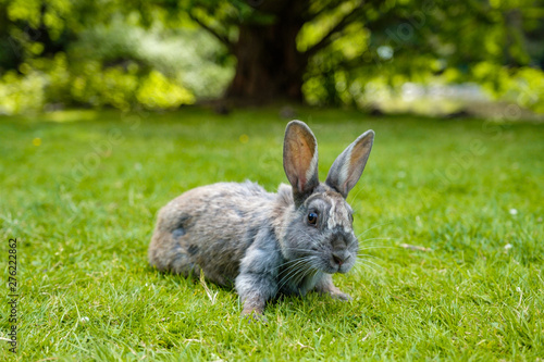 © Yi, Fototapeta premium cute grey rabbit laying on green grassy ground in the park staring at you