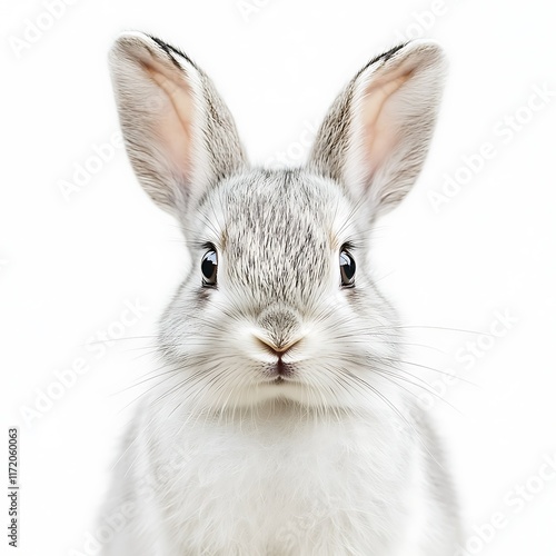 Obraz premium Cute grey rabbit portrait, white background, Easter, pet.