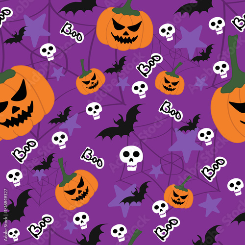 Fototapeta premium Cute Halloween background with pumpkins, bats, skulls and purple stars