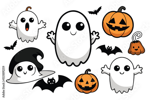 Fototapeta premium Cute Halloween Cartoon Ghosts and Pumpkins Vector Illustration Set