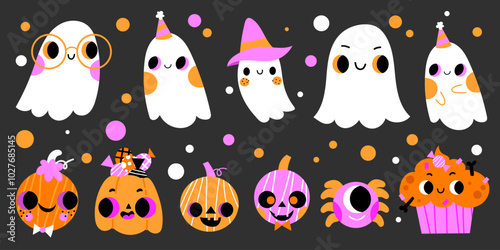Fototapeta premium Cute halloween ghost pumpkin trick or treat celebration spider cake cartoon set collection.
