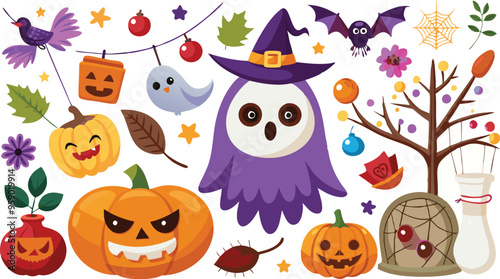 Naklejka premium Cute Halloween holiday set - ghost, owl, pumpkin, star, candy, berry, branch,...