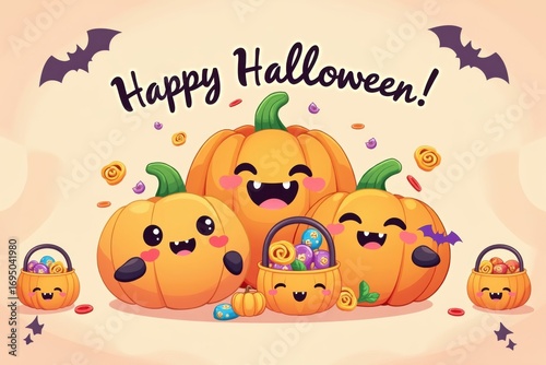 Obraz premium Cute halloween pumpkins and candy with happy halloween text
