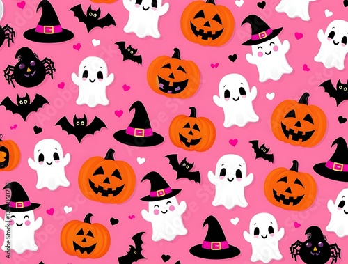 Fototapeta premium Cute Halloween seamless pattern with smiling ghosts, jack-o'-lanterns, bats, spiders, and witch hats on a pink background, perfect for festive decorations, textiles, and wallpapers