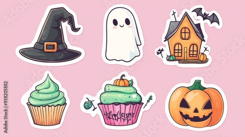 © Kittipong, Fototapeta premium Cute Halloween Stickers A Witchs Hat Ghost Haunted House Cupcakes and JackoLantern on a Pink Background