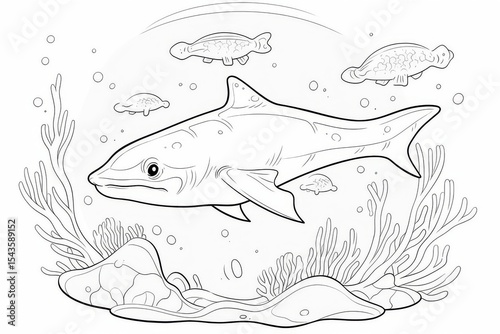 © Ruiqi, Fototapeta premium Cute hammerhead shark swimming among jellyfish coloring page with crisp black lines on white background for kids