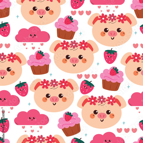 Obraz premium cute hand drawn cartoon pig with flower crown and pink stuff seamless...