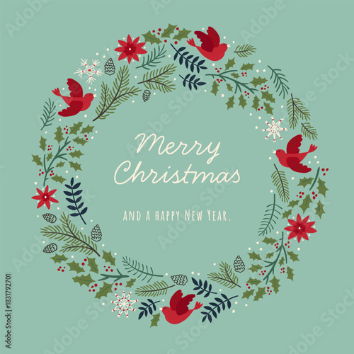 Obraz premium Cute hand drawn Christmas greenery and birds, great for prints, textiles, banners, wallpapers - vector