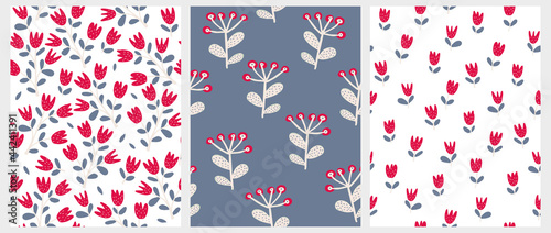 © Magdalena, Fototapeta premium Cute Hand Drawn Floral Seamless Vector Patterns. Red Flowers and Twigs Isolated on a White and Pale Dark Blue Background. Infantile Style Floral Print for Fabric, Textile. Abstract Garden.