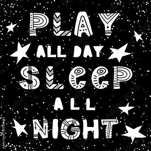 © samotan, Fototapeta premium Cute hand drawn nursery poster in scandinavian style, black and white art. Play all day sleep all night slogan graphic for kids design.