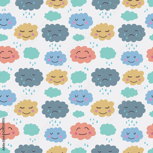 © mejorana777, Fototapeta premium Cute hand drawn seamless pattern with clouds. Background for kids with smiling clouds. Vector illustration