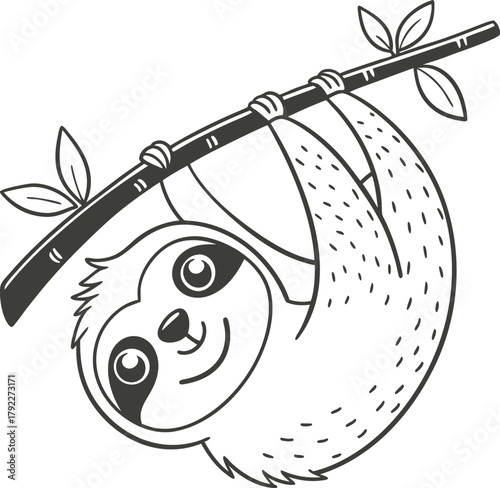 © Svg Stock, Naklejka premium Cute hand drawn sloth hanging from a tree branch with leaves