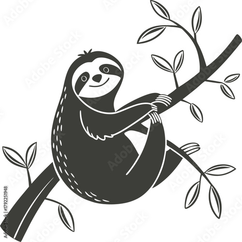 © Svg Stock, Naklejka premium Cute hand drawn sloth hanging on a tree branch with leaves