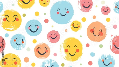 © Eireen, Fototapeta premium Cute hand drawn smiley faces pattern with colorful circles on white background