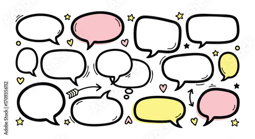 Obraz premium Cute hand drawn speech bubbles with hearts and stars for social media messaging and creative design projects