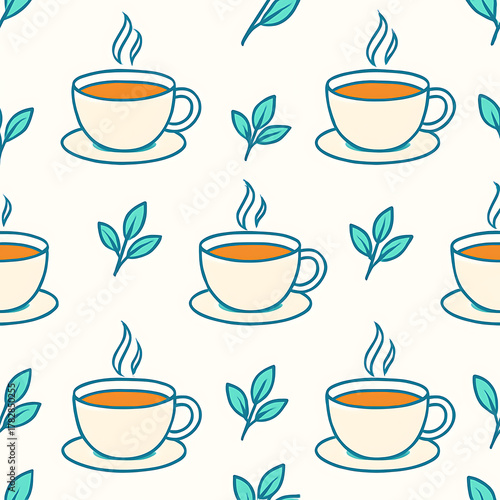 © UmmuAfifah, Obraz premium Cute HandDrawn Tea and Leaves Seamless Pattern.