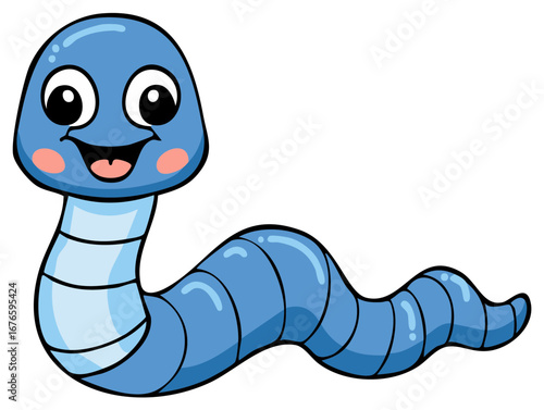 Fototapeta premium Cute happy blue cartoon worm smiling with big eyes and pink cheeks whimsical illustration