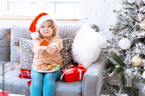 Obraz premium cute happy little girl with curls in Santa hat is sitting on chair near Christmas tree with plate of Christmas gingerbread cookies in her hands, New Year and Christmas family concept