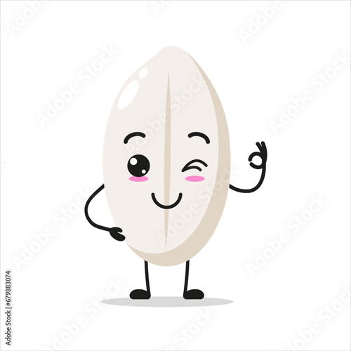 Obraz premium Cute happy rice character. Funny smiling and wink food cartoon emoticon in...