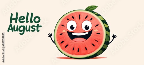© shadowart, Fototapeta premium Cute happy watermelon character surronded watermelon slices, on light beige background. Smiling fun fruit cartoon character. Creative calligraphy design. For advertising, card, banner. Copy space.