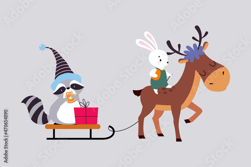Fototapeta premium Cute Hare on Deer Pulling Sledge with Raccoon and Gift Box Enjoying Winter Season Vector Illustration