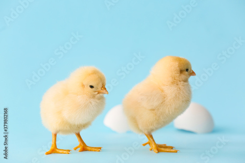 © Pixel-Shot, Fototapeta premium Cute hatched chicks on color background