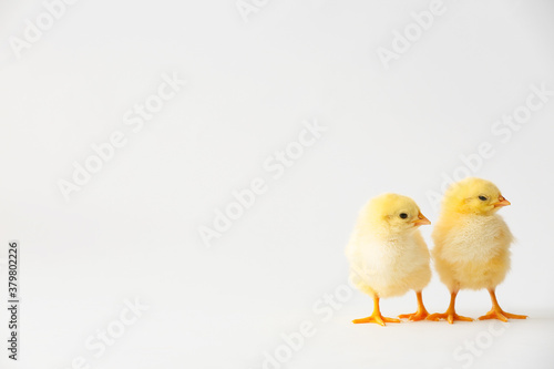 © Pixel-Shot, Obraz premium Cute hatched chicks on light background