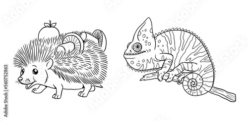 © Lunstream, Fototapeta premium Cute hedgehog and chameleon to color in. Template for a coloring book with funny animals. Coloring template for kids.