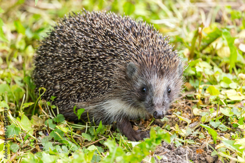 © Garmon, Fototapeta premium Cute hedgehog on a spring foliage while eating tasty fresh springtime grass. Animal in the wild