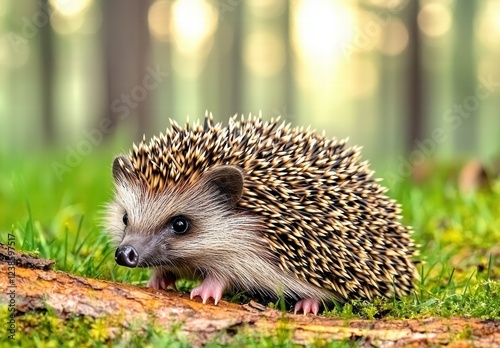 © Phunnada, Fototapeta premium Cute Hedgehog on a Tree Log Surrounded by Green Grass in Nature