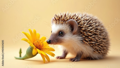 © Vadym, Fototapeta premium Cute hedgehog sniffs yellow flower. Soft spines, focused on the flower. Adorable animal, nature, wildlife, spring season vibes. Charming little mammal, beautiful floral aroma.