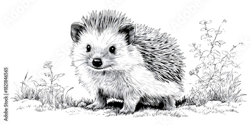 © Ivan, Naklejka premium Cute hedgehog standing in grass line art drawing