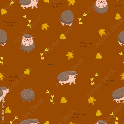 © Екатерина Зирина, Obraz premium Cute hedgehogs on a brown background seamless pattern. Vector graphics.