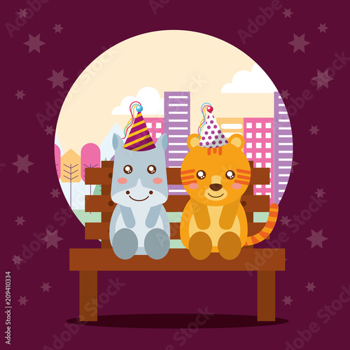 Fototapeta premium cute hippo and tiger sitting in bench on city happy birthday card vector illustration