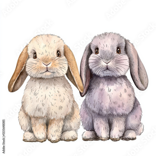 © Photo Graphic Stock, Fototapeta premium Cute Holland Lop Rabbit, Two adorable hand drawn watercolor rabbits with floppy ears, sitting together,Kawaii bunny Isolated design on white background