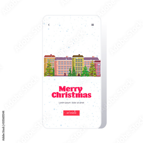 Obraz premium cute houses in winter season snowy town street merry christmas happy new year greeting card holidays celebration concept smartphone screen mobile app cityscape snowfall background vector illustration
