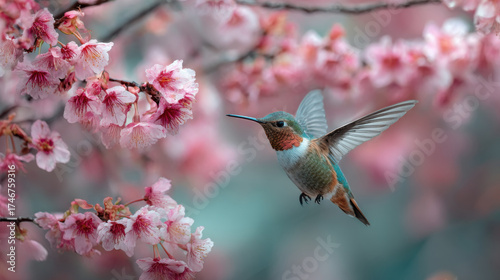 Fototapeta premium Cute hummingbird flying among colorful blossoms creates serene and vibrant...