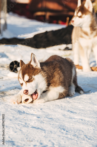 © R, Naklejka premium Cute husky puppy eating bone in winter snowy weather.