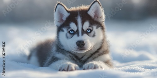 Naklejka premium Cute husky puppy playing in the snow during winter with a serene backdrop and...