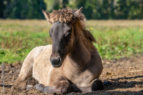 © Magnus, Fototapeta premium Cute Icelandic horse foal lying down in the autumn sunlight