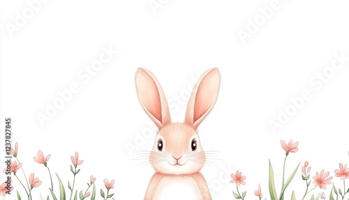 Obraz premium Cute illustrated rabbit surrounded by delicate pink flowers on a white...