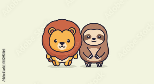 © gudangPIXEL, Obraz premium Cute illustration of a lion and sloth standing together on a neutral background