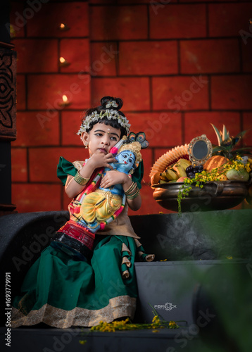 Fototapeta premium Cute Indian child dressed in traditional attire hugging Lord Krishna idol...