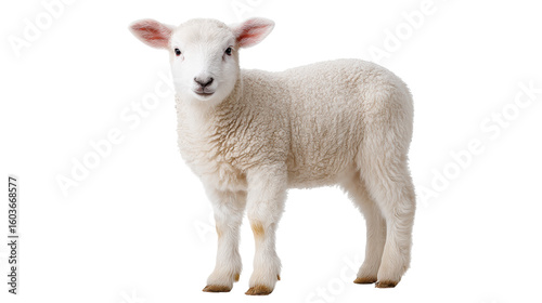 © Oatkhaphon, Obraz premium Cute isolated lamb stands on transparent background showing soft wool and innocence