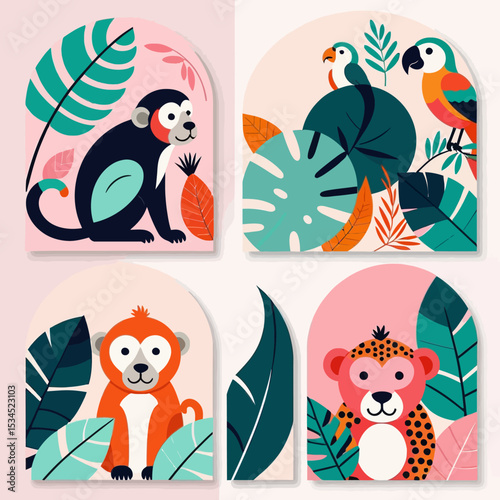Obraz premium Cute Jungle Animal Art Prints-Colorful Monkeys Parrots and Tropical Leaves-Modern Kids Room Decor-Playful Animal Illustrations for Nursery Walls