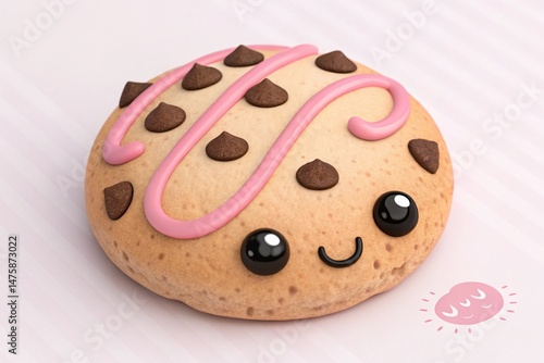 © CarlosAlberto, Fototapeta premium Cute Kawaii Chocolate Chip Cookie With Pink Icing - generated by ai
