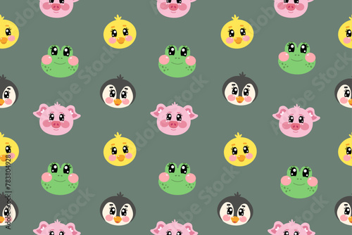 Fototapeta premium Cute kawaii seamless pattern with penguin, chick, frog and pig for kids on green isolated background