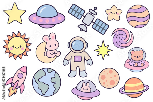 Naklejka premium Cute Kawaii Space Clipart – Astronaut, Planets, UFO & Stars