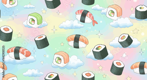 © vectorT, Naklejka premium Cute kawaii sushi pattern on a pastel rainbow sky with clouds and stars. Whimsical food illustration.